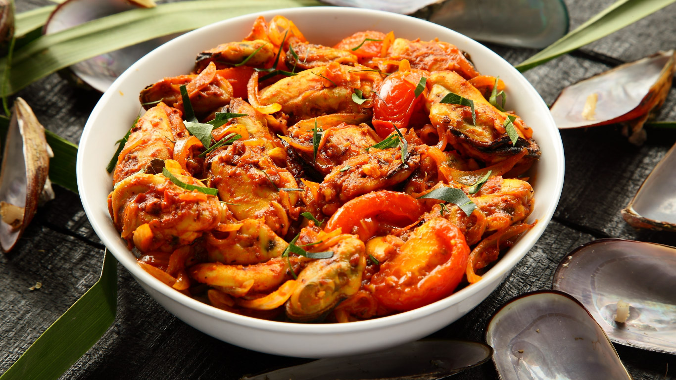 Mussels are boiled and then cooked in a typical Kerala-style spice mix to prepare this delicious delicacy. They are served along with white rice and curry.