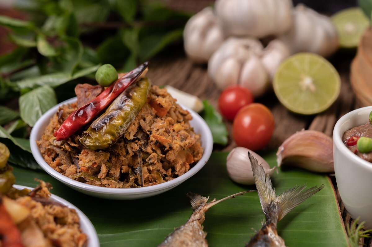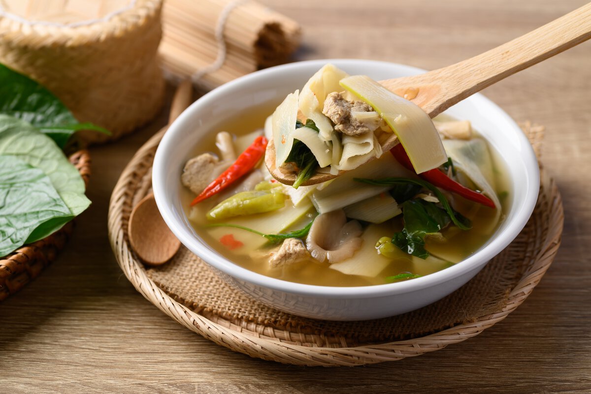 Steamed rice, pork curry, smoked meats, or vegetable stews, as well as bamboo shoots, complement these dishes perfectly, enhancing their flavour with their subtle sourness and crunch.